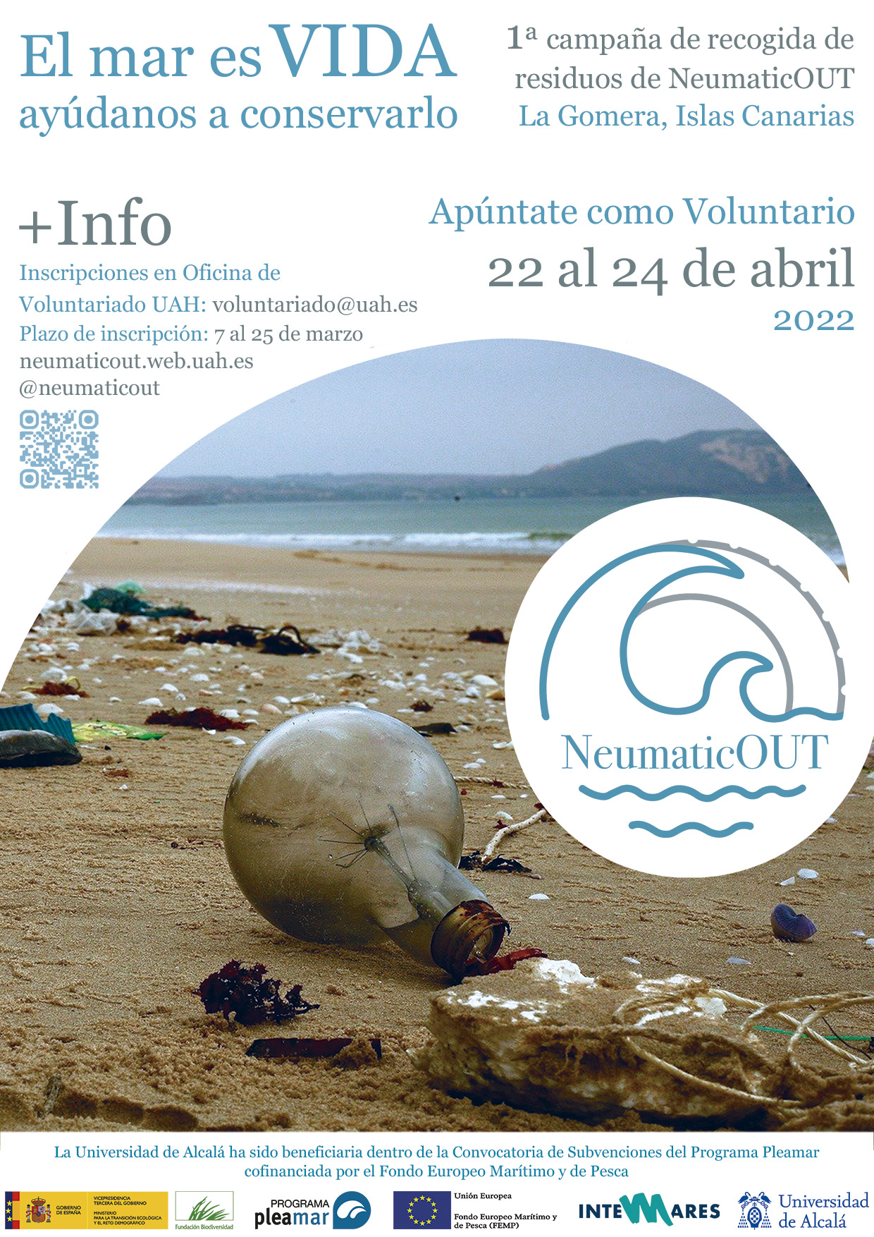 Cartel informativo sobre la primera jornada de recogida de residuos del proyecto NeumaticOUT de la Universidad de Alcalá de Henares.