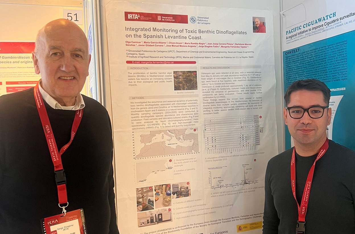 Durante el congreso, los investigadores Jorge Diogène Fadini y Joan Josep Cervera-Piñana presentaron los resultados más recientes del proyecto en una comunicación científica bajo el título. "Integrated monitoring of toxic benthic dinoflagellates on the Spanish Levantine coast" (Monitoreo integrado de dinoflagelados bentónicos tóxicos en la costa levantina espanyola. Los investigadores expusieron el sistema de monitoreo integrado desarrollado en el marco del proyecto LEVABENTOX para la detección y seguimiento de dinoflagelados bentónicos potencialmente tóxicos en la costa sur del Levante español.