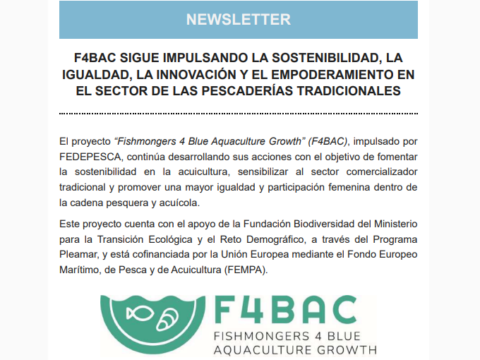 El proyecto Fishmongers 4 Blue Aquaculture Growth” (F4BAC), impulsado por FEDEPESCA, continúa desarrollando sus acciones con el objetivo de fomentar la sostenibilidad en la acuicultura, sensibilizar al sector comercializador tradicional y promover una mayor igualdad y participación femenina dentro de la cadena pesquera y acuícola.