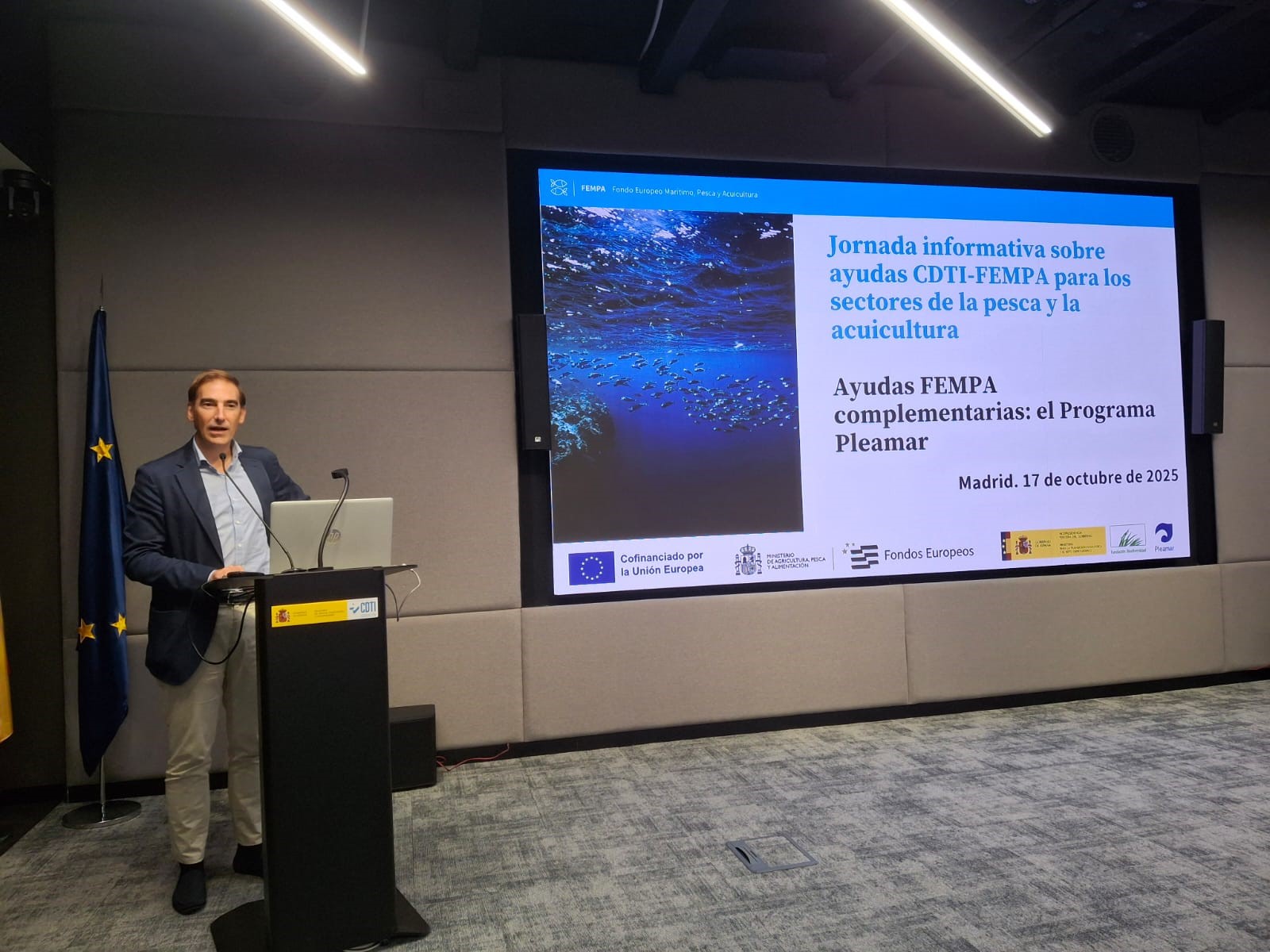 Carlos Franco Alonso del CDTI ha sido el encargado de presentar las ayudas CDTI-FEMPA para apoyar la innovación y la inversión en los sectores de la pesca y la acuicultura.